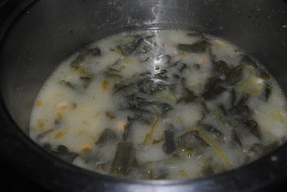 Al final, cuando ya el caldo esté trabado agrego la clara de huevo picadita. A quienes les guste pueden poner unas hebras de bacalao desalado, en los últimos tres minutos de cocción.